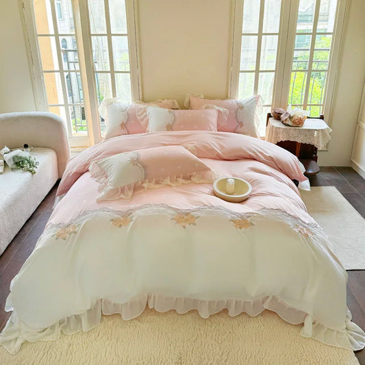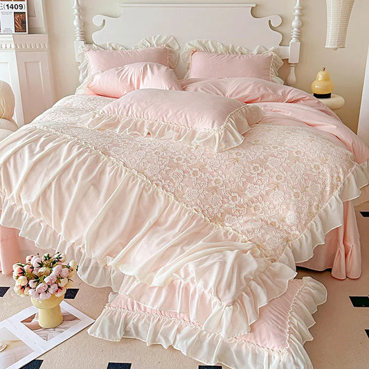 Pink Lace Ruffle Duvet Cover Set - Luxury Bedding for Girls & Women