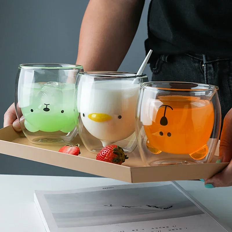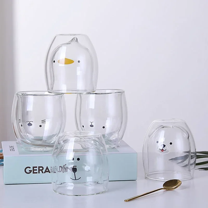 Cute Animal Glass Coffee Mug - Double Layer, Insulated
